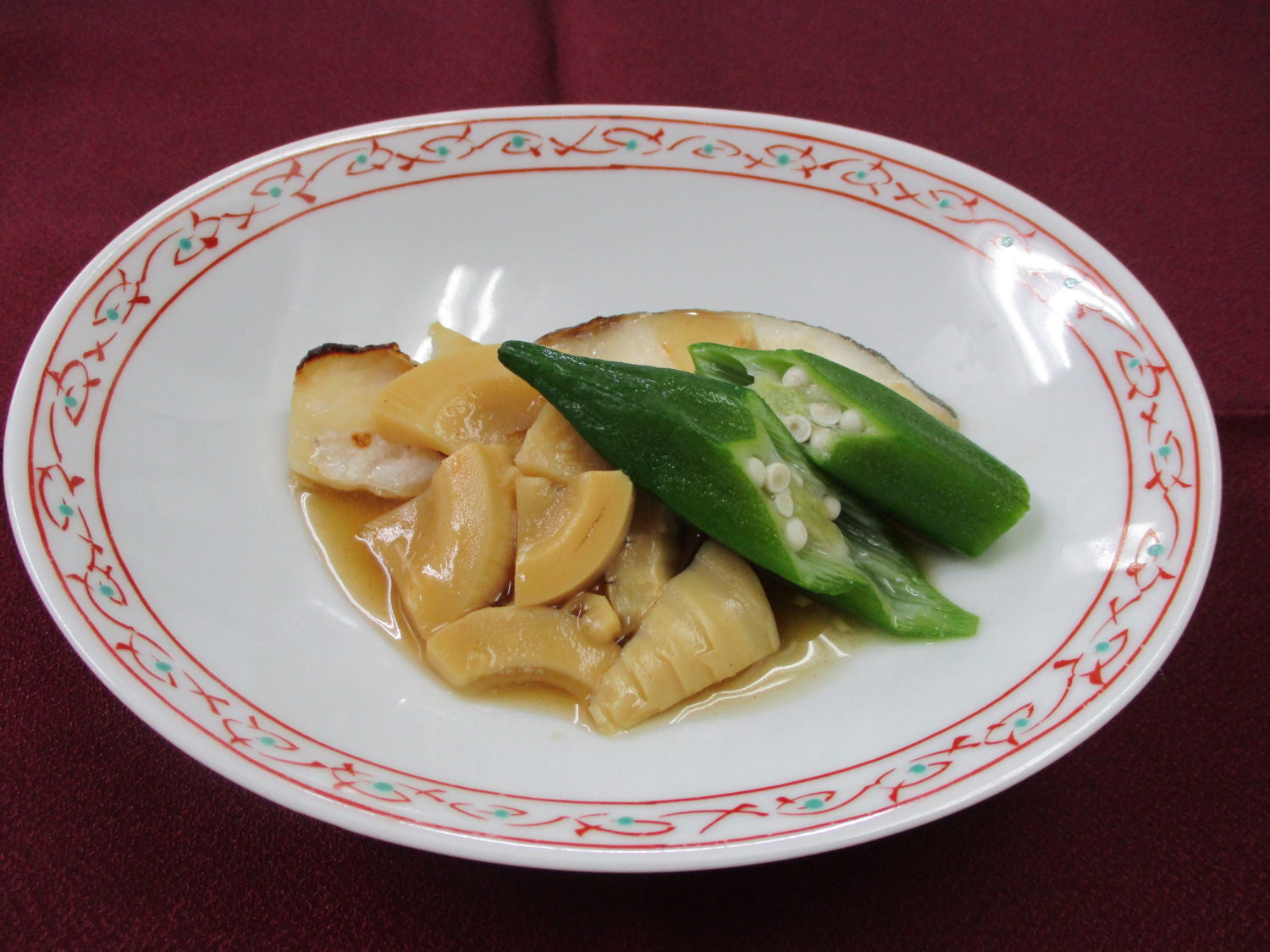 ご飯、キャベツと油揚げのみそ汁、ほっけのみりん漬焼き、チンゲン菜とひき肉の炒め物、春巻き、蒸し鶏根菜ごまサラダ、しそ昆布