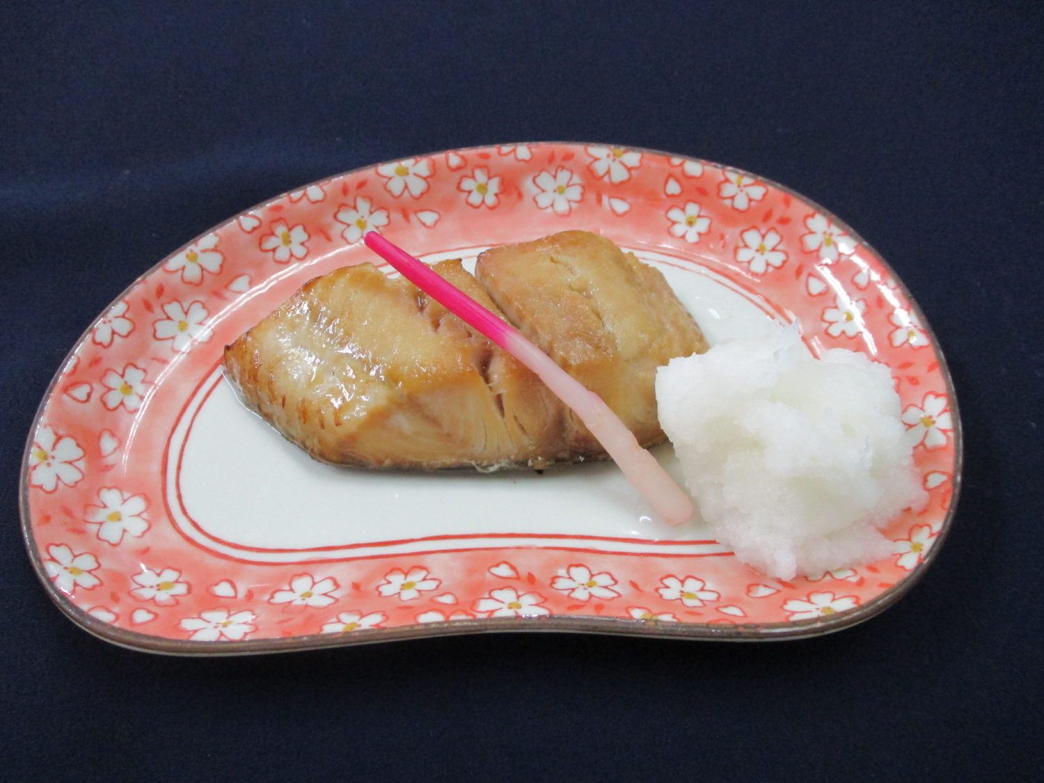 ご飯、小松菜と油揚げのみそ汁、豚肉のおろしポン酢がけ、なすと高野豆腐の煮つけ、キャベツと竹輪の辛子和え、野沢菜漬、ラブレ