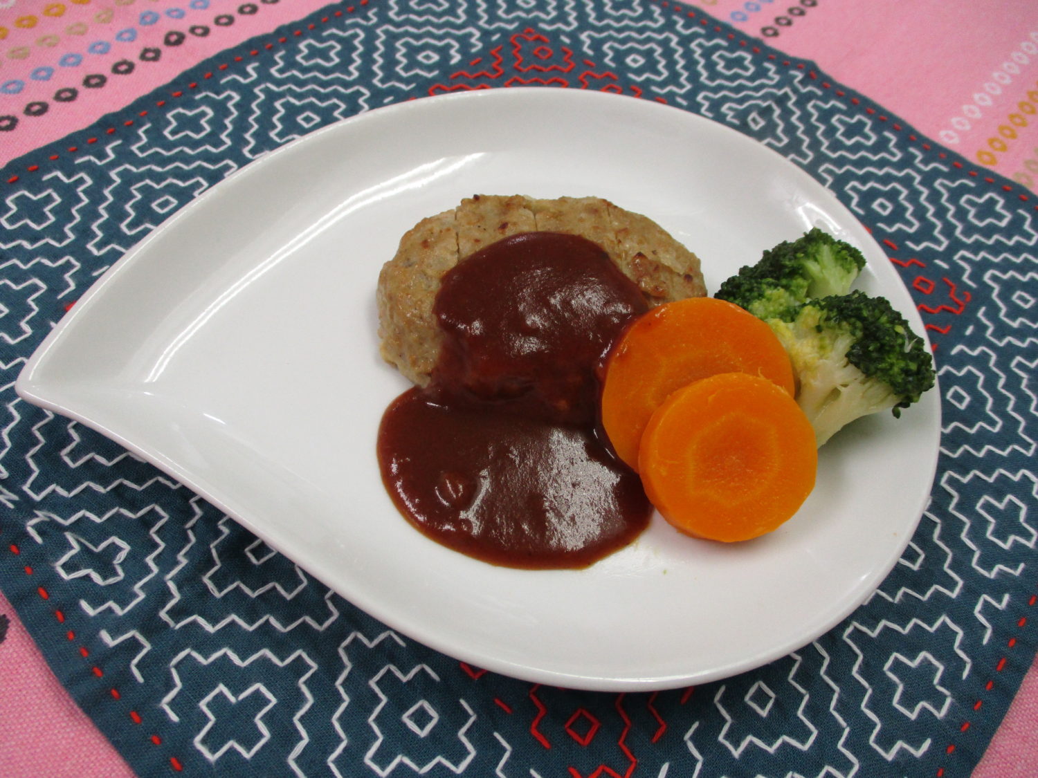 ご飯、わかめスープ、ハンバーグデミソース、白菜とエリンギの甘酢炒め、こんにゃくのずんだ和え、べったら漬、みかんヨーグルト