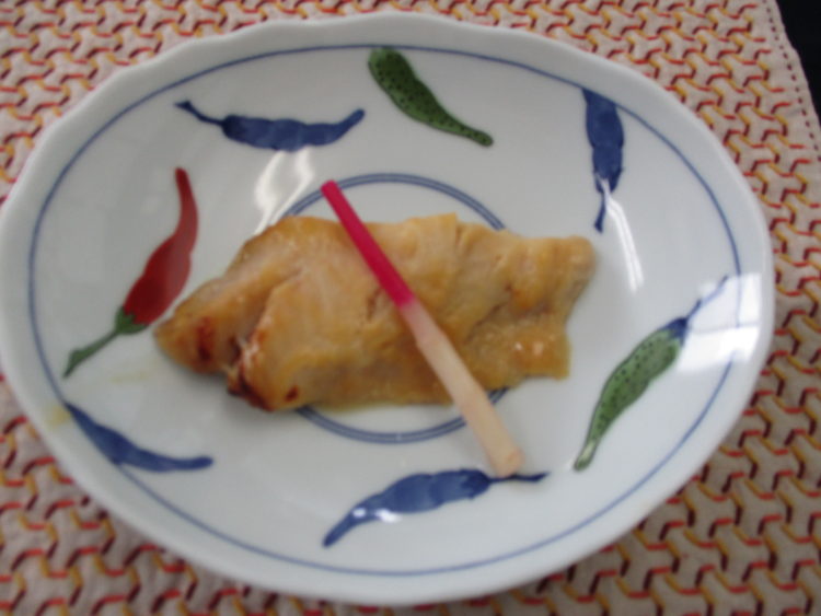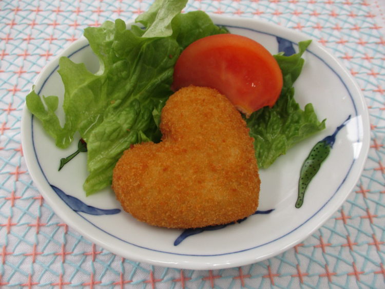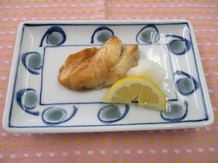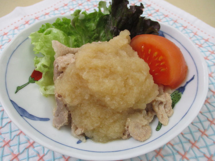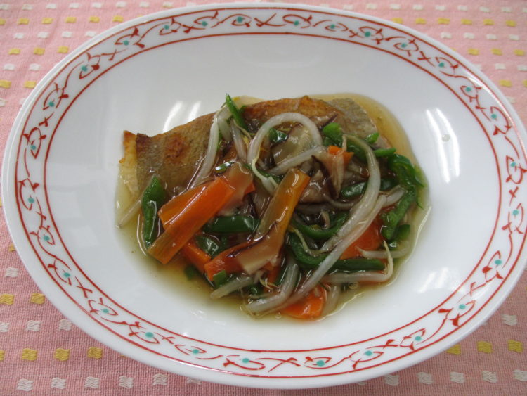 ご飯、里芋とねぎのみそ汁、かれいの甘酢あんかけ、なすの中華風ソテー、コーンシュウマイ、しそ昆布、青りんごゼリー