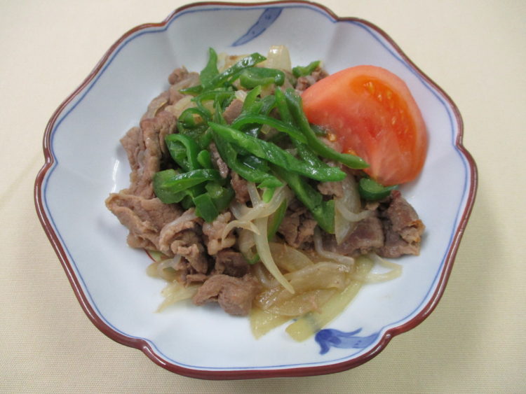 ご飯、なめこと大根のみそ汁、牛肉と玉葱のオイスターソース炒め、卯の花といかの炒り煮、ブロッコリーのかにあんかけ、のり佃煮、ピーチゼリー