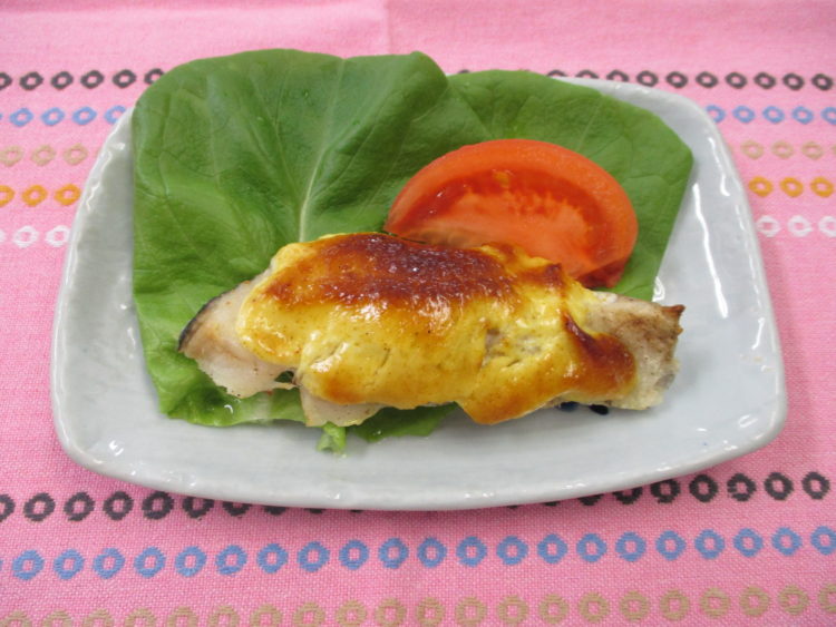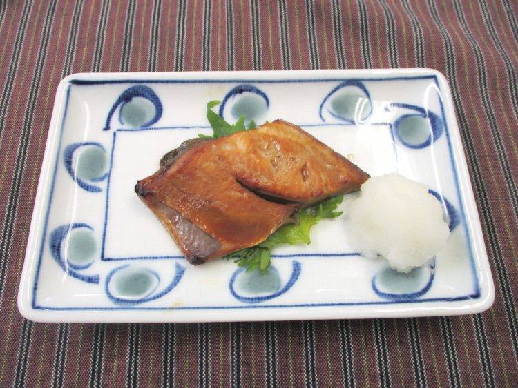 ご飯、なすと油揚げのみそ汁、さわらのごまダレ焼き、すき昆布と豚肉の炒め物、
