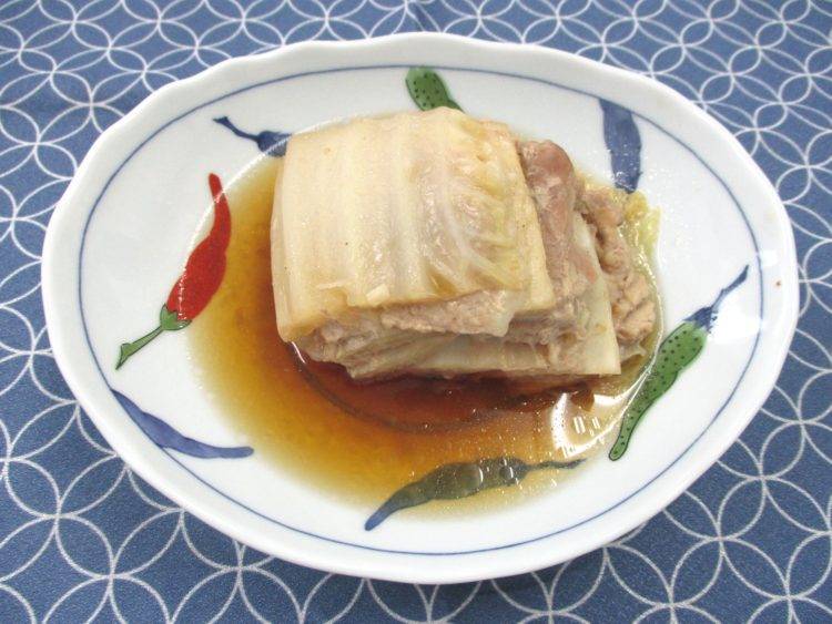 ご飯、なるとと三つ葉のみそ汁、豚肉と白菜の重ね蒸し、カリフラワーのカレーソテー、