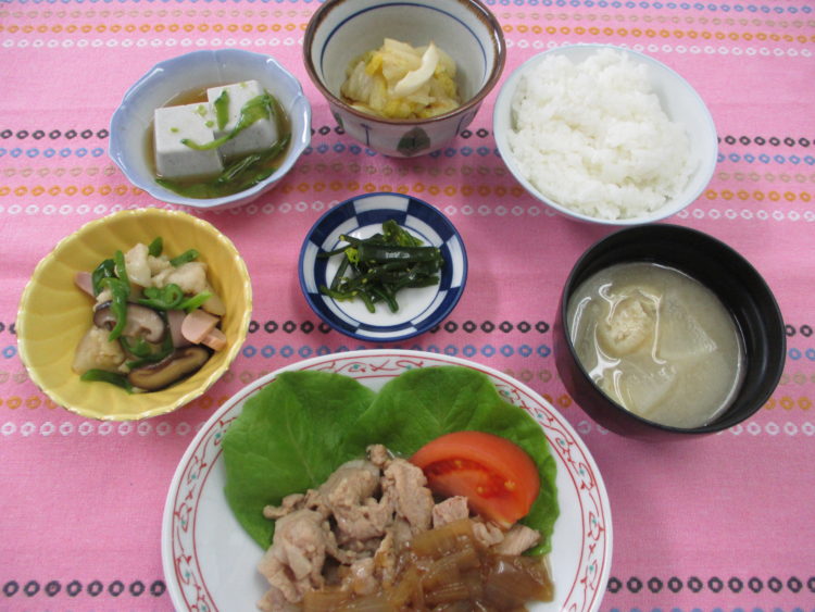 ご飯、大根と油揚げのみそ汁、ポークソテーオニオンソース、カリフラワーとソーセージのソテー、ごま豆腐、白菜の辛子和え、わかめ磯漬