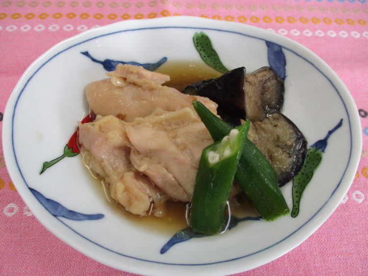 ご飯、なすと油揚げのみそ汁、さばのマスタードソテー、じゃが芋のそぼろ煮、切干大根としらすの和え物、相馬きゅうり漬、りんごゼリー