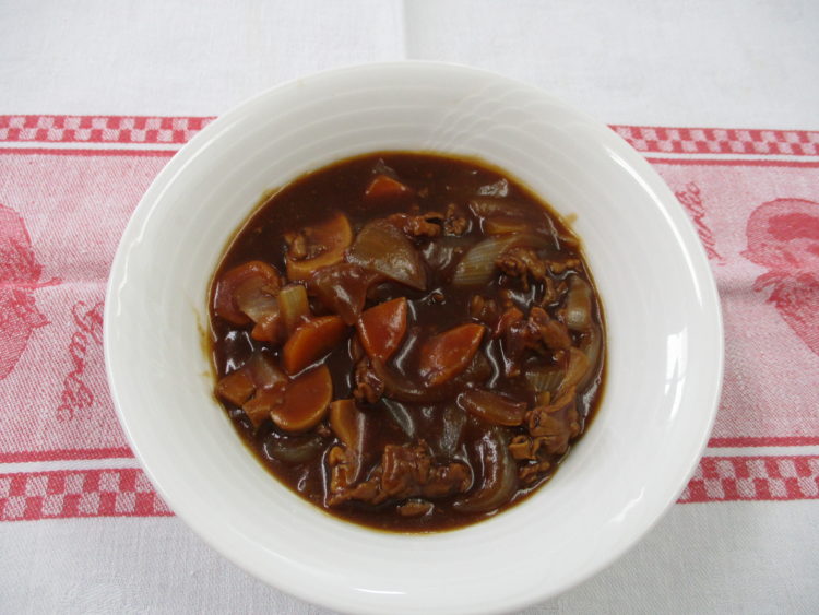 ご飯、オクラと豆腐のスープ、薄切り牛肉のハヤシライス、アスパラとえびのサラダ、かぶと椎茸の含め煮、福神漬、青りんごゼリー